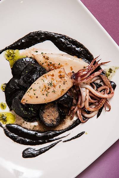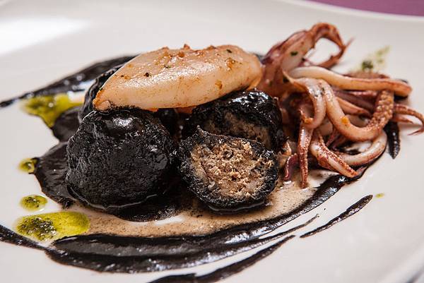 香煎小卷牛肉丸,加入浸泡了牛奶的法國麵包,整個牛肉丸變得扎實而香氣十足,裹上鮮美的墨魚醬汁,與鮮嫩的煎小卷一起食用,令人愉悅的美味組合。