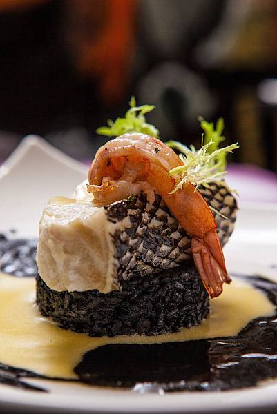 油封鱈魚佐墨魚燉飯,以低溫油泡的方式處理的圓鱈魚,肉質細緻帶彈性,搭配由西班牙墨魚醬汁燉煮入味的彈Q米飯,鮮香滿嘴。