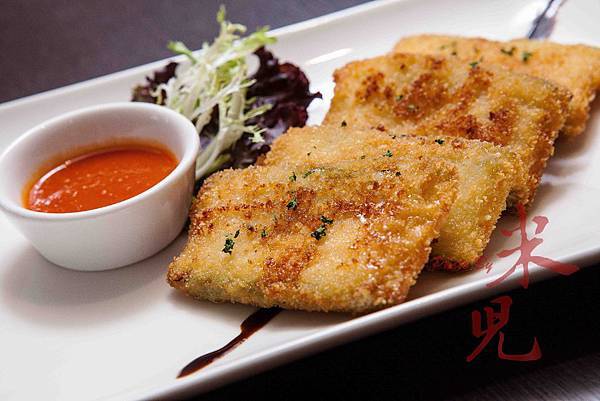 酥炸起司餅,看起來平淡無奇的起司餅,裡頭包著西班牙燻肉、節瓜和切達起司,裹上麵包粉後油炸,咬開後起司淌流而出,蹦發出酥香濃腴的好味道。