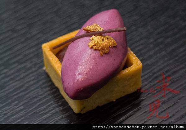 軟心巧克力塔佐黑醋栗奶油,上頭的紫色是用奶油乳酪加黑醋栗去打成的,配上Manjari孟加里巧克力64%做成的巧克力塔,酸甜而有層次的風味,愛吃塔類點心的我很喜歡它~~