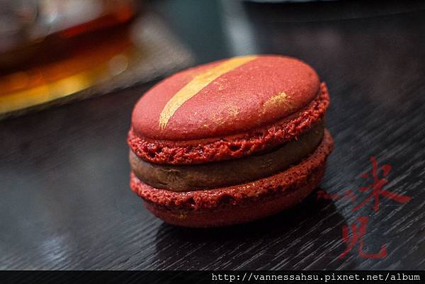 這是限定款的馬卡龍,焦糖馬鞭草口味,有著很優雅的紅色色殼,抹上金粉看起來好有質感,餡料是用馬鞭草浸在奶油中,再融入焦糖巧克力,吃起來的味道非常複雜而有變化,這款馬卡龍不單獨販售,因為做法太麻煩了,但真的吃完會讓人懷念的獨特風味!
