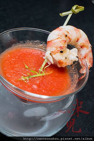 開胃小品是明蝦番茄冷湯,源自西班牙南部的冷湯,是用番茄加上芹菜、大蒜和多種蔬菜打成的,最後加上冰槙甜蝦,整個喝完感覺相當酸香清爽。
