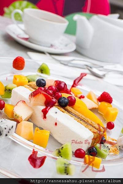 透明盤子裡盛裝的荔枝千層派,在大量水果搭配下,看起來的確秀色可餐~