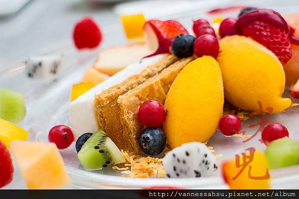 這天米兒來這裡,順便也吃了一分有季節性的甜點,荔枝千層派,這由的盤飾甜點上桌後看起來依然豐盛,色彩繽紛,因為加了許多水果丁,看起來更熱鬧,再搭配上自製的水果冰沙,我想對很多愛吃冰的人來說,真的是一分很棒的甜點,可惜米兒對冰的耐受力實在太低,所以只敢淺嘗,不過,這荔枝千層派搭配的芒果冰沙和葡萄柚冰沙,吃起來真的有很新鮮的水果酸香,味道的確不賴!