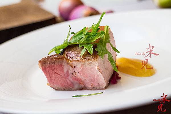 乾式熟成豬肉的美味,真令人驚訝而無法想像,直接吃很美味,搭配盤邊的香草籽蘋果泥又是不同的滋味~