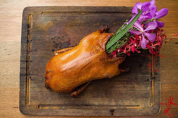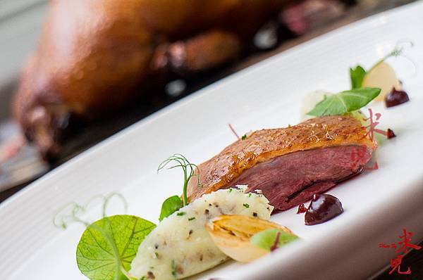 上星期,陳師傅就興奮地告訴米兒,他的研究成果終於可以發表了,迫不及待的我,馬上趕第一個去試試他的乾式熟成鴨,只見陳師出一個大大的木板,上面放著一隻.......北京烤鴨?唔~~除了屁股的地方有一個大的開口、烤出來的表皮上有一些像娠娠紋般的紋路之外,這烤得表皮金黃的鴨子,看起來真的跟北京烤鴨沒兩樣,於是陳師傅開始解釋這鴨子的與眾不同。原來,師傅是選用養在花蓮地區的「英桃種北京鴨」,因為這種鴨子的肉質纖維比較細,而且特別挑選重量達到五斤的肥鴨子,其皮下脂肪才夠肥厚,放在陳師傅不願公開的「秘密乾式熟成室」裡,經過21天的熟成之後,表皮會變得乾扁,顏色呈土黃色。此時,陳師傅會以中心55度C的設定,先把鴨肉加溫,然後再進烤箱把鴨皮烤上色,呈現漂亮的金黃色,就像是北京烤鴨般,然後,只取下二片鴨胸供餐,其餘部分則另作他用,所以,一隻乾式熟成好的鴨子,只能供應二客,呈盤後的鴨肉,表皮酥脆,而肉質則呈現五分熟的粉紅色!