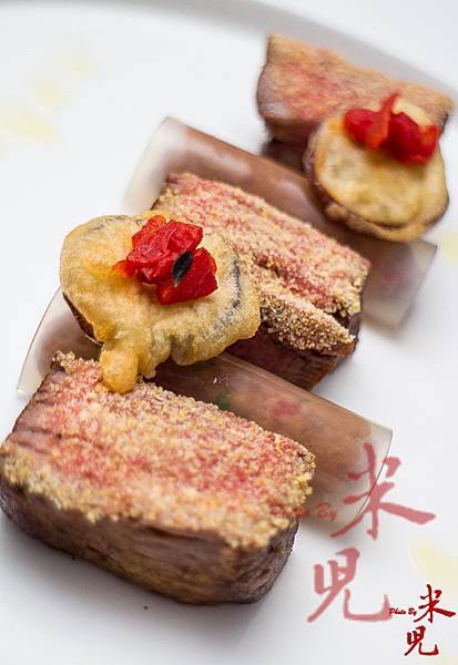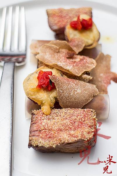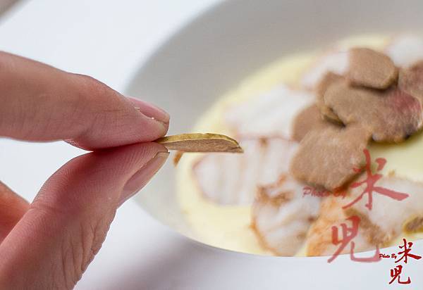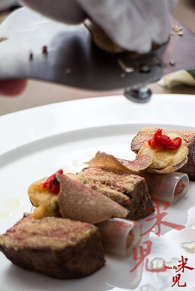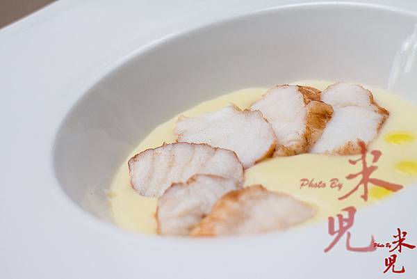 但可別看他長得很粗獷,他的手藝卻十分細膩,雖然在上菜的時候,那菜色看起來沒有太花俏的擺盤或是令人眼睛為之一亮的視覺效果,但他的菜真的非常「耐吃」,也就是在入口瞬間,就能感受到那蘊含在菜裡頭的爆發力!後來才知道,原來這次他的菜色緊扣著白色的主題,所以上菜時看到的幾乎也都是以米白色和大地色系為主,讓人感受到秋冬的氛圍!
