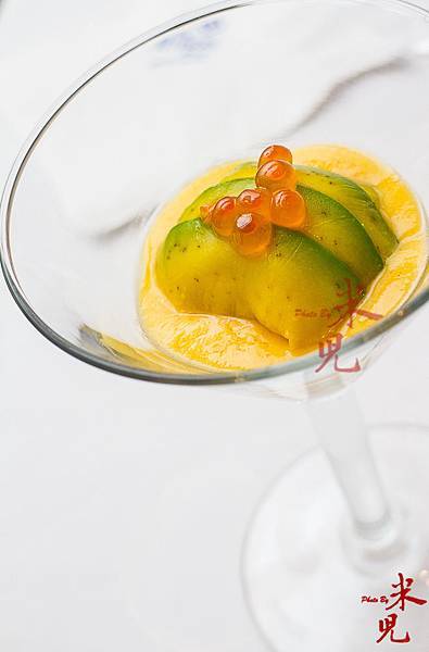 開胃菜是香檳蝦酪梨卷、加拿大鮭魚卵。很難得把酪梨做得如此滑潤但吃起來不膩,微帶酸甜的醬汁,讓卷在裡頭的蝦子吃起來特別鮮甜,配上鹹香的鮭魚卵,視覺效果和吃起來一樣迷人。