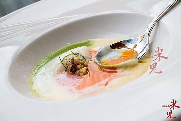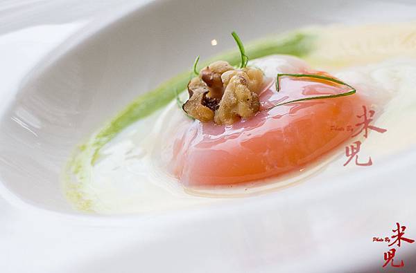舒肥香檳雞蛋、白乳酪醬、豌豆泥。這道前菜真的是非常非常能表現食材美味的做法了,因為香檳雞蛋本身的品質就很好(蛋黃可以插20根牙籤而不會破!)即使生食都沒有什麼蛋腥味,主廚以低溫舒肥手法處理成半熟蛋,配上鹹香有奶味的白乳酪醬,再以豌豆泥解膩,真的一絕~