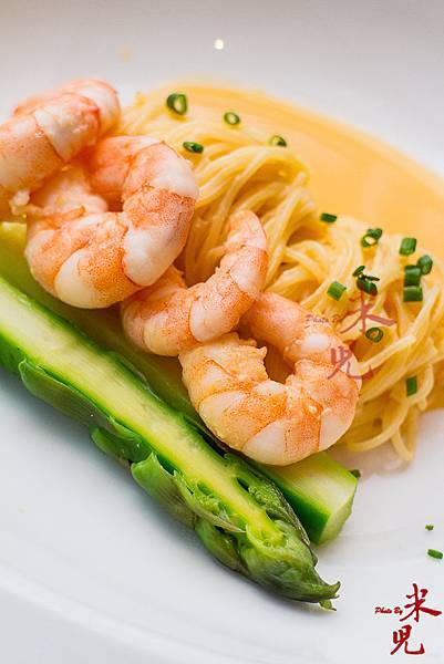 煎炒香檳蝦,海膽醬天使麵。香檳蝦的肉質緊實有彈性,不需太多調味就很好吃,而吸飽海膽醬的天使麵,滑溜爽口,醬汁濃腴,分量少少卻讓人意猶未盡。