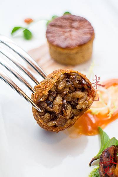 酥炸松露香檳茸球,是把香檳茸和松露拿來炒飯,做成飯丸後再裹粉炸過,咬下去讓人驚喜,搭配茄汁很是清新,風味很多層次,有意大利炸飯丸的那種況味在。