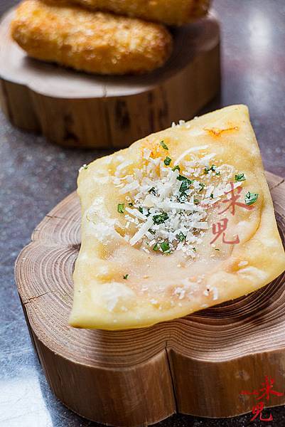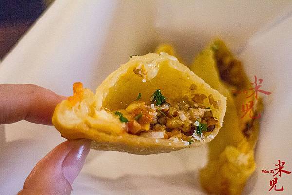 炸麵餃,外皮是具有彈性的義大利麵餃皮,內餡是帶點咖哩味的豬肉,熱熱地吃很爽口~~