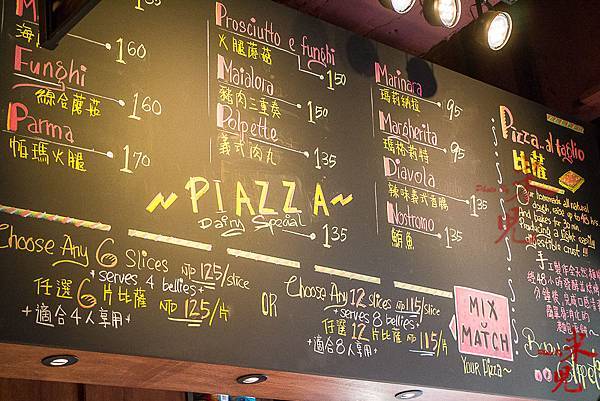 PIAZZA的菜單只有一張,但是內容非常豐富,包括方形片狀的Pizza、手工麵做的Pasta、湯品、沙拉、義式炸食與甜點、冰淇淋,在陳列櫃上,也兼賣鹽、胡椒、橄欖油、酒醋,以及來自義大利的各式設計生活用品,感覺就像是走進了義大利的街邊小生活裡,正符合了「PIAZZA」(義大利文中指的是廣場、市場的意思)這個店名;置身在挑高的空間裡,聽得是義大利的廣播節目,吃得是很地道的義大利風味,讓人第一次來就愛上這個地方。