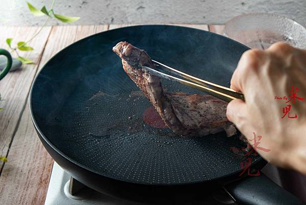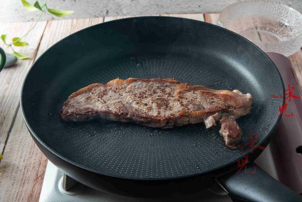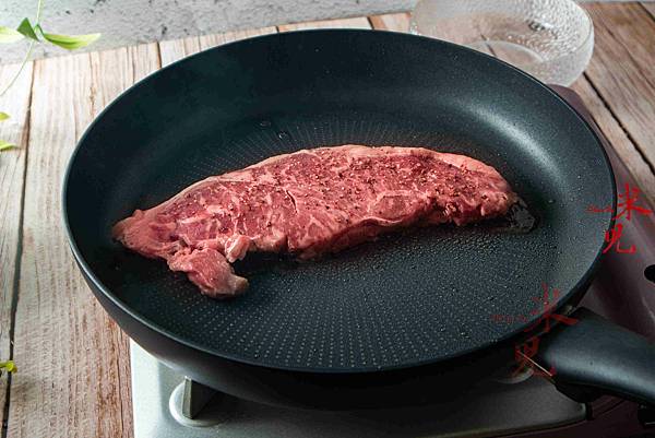 平底鍋,當然是用來煎牛排最佳利器囉!剛好家裡還有之前楊總送的紐約克牛排!我相信很多人在家煎牛排時,常常在翻面時會發現,為什麼我煎的牛排都白白的,上色不漂亮?其實就是和下鍋的溫度有很大的關係,牛排需要瞬間高溫鎖住表面,才能讓肉汁鎖在裡面不流失,而且也能藉由高溫進行的梅納反應,讓牛排表面上色,產生迷人的香氣。