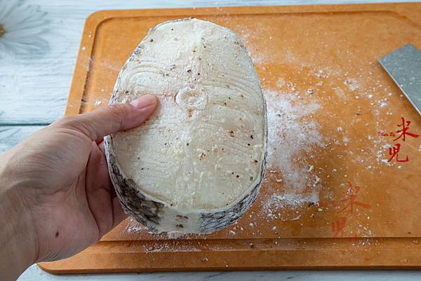 我想要表皮有微酥的口感,所以拍了薄薄的麵粉上去。以往拍上薄麵粉去煎的魚,一不小心就讓這麵衣給貼在鍋底了,這次來試試特福鍋具的不沾功力。