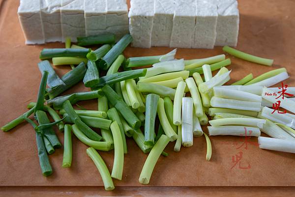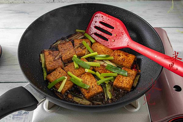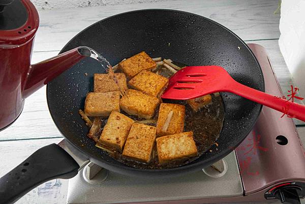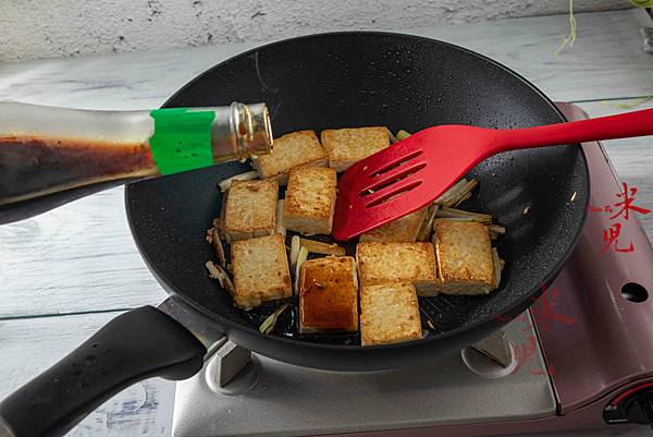 煎到一面上色之後,把全部豆腐翻面,再把蔥白和少許蒜末放進去一起煎炒(若喜歡吃辣可以此時放辣椒片下去)。豆腐要翻面不破有個小秘訣,就是用鍋鏟把豆腐推到鍋緣,然後用筷子輔助翻面,就能輕鬆把豆腐完好無缺地翻身囉!