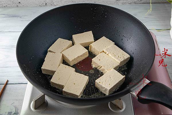 鍋子開始加熱後,中間的佳溫紅心變色,即可倒入約二大匙的油,把豆腐放進去,中火開始煎。以前用其他鍋具時,總是要用手來感受鍋子的溫度來判斷食材下鍋的時間,特福這個佳溫紅心,能讓你在鍋子升溫時還能安心去洗個手或是切個蔥什麼的,不必一直顧在鍋子旁怕錯過食材下鍋的最佳時機,其實真的很方便。