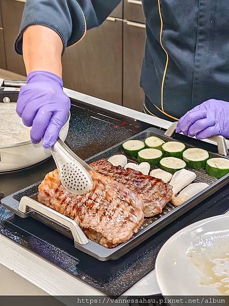 只見馬克老師將四片厚片牛排一一放在長鑄鐵盤裡,隨著牛肉香四溢,牛排翻面瞬間大家都忍不住驚呼!「這牛排烙紋也太美了吧!」完全沒有上色不均的問題。而且,這感應爐的火力似乎也很夠,因為煎牛排講究「高溫封住表面」,而我們在『SMEG智慧感應爐』旁,明明沒感覺到熱氣,但是牛排就是可以煎得這麼漂亮!